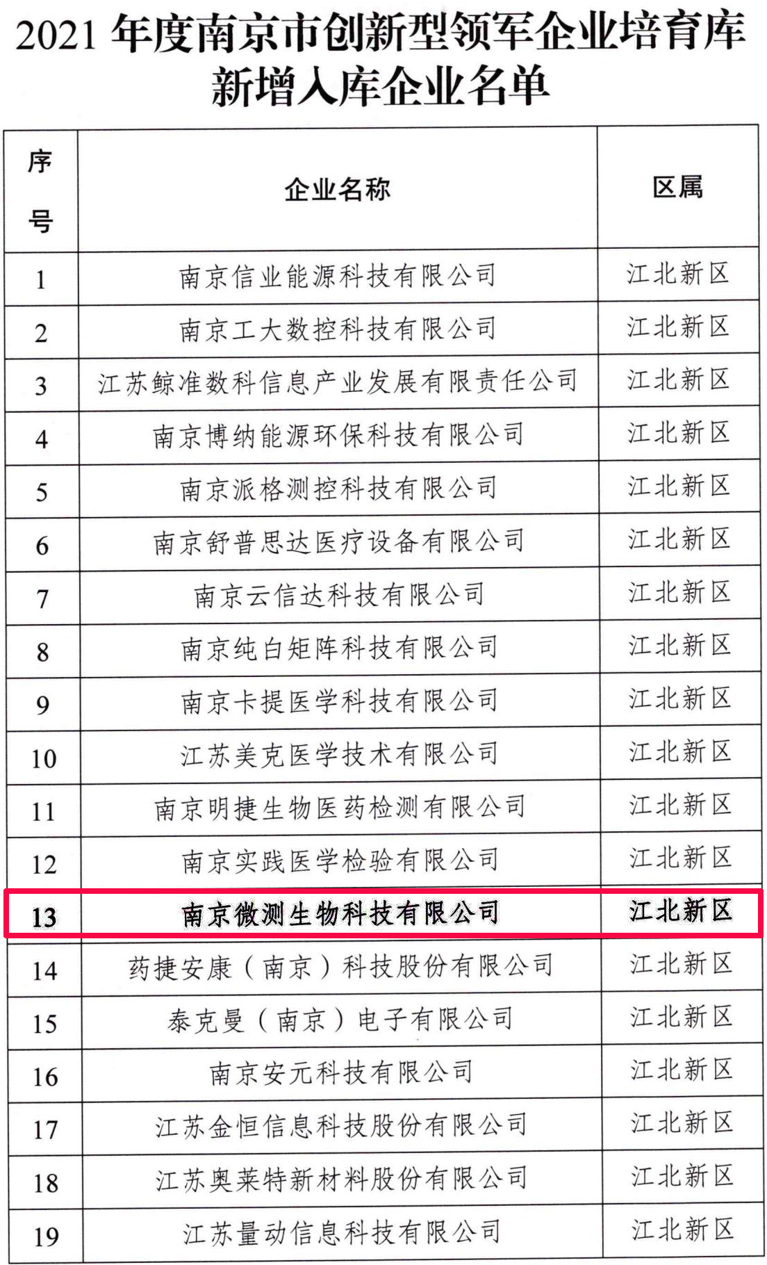 南京微測(cè)生物科技有限公司成功入選2021年度南京市創(chuàng)新型領(lǐng)軍企業(yè)培育庫入庫企業(yè)榜單。